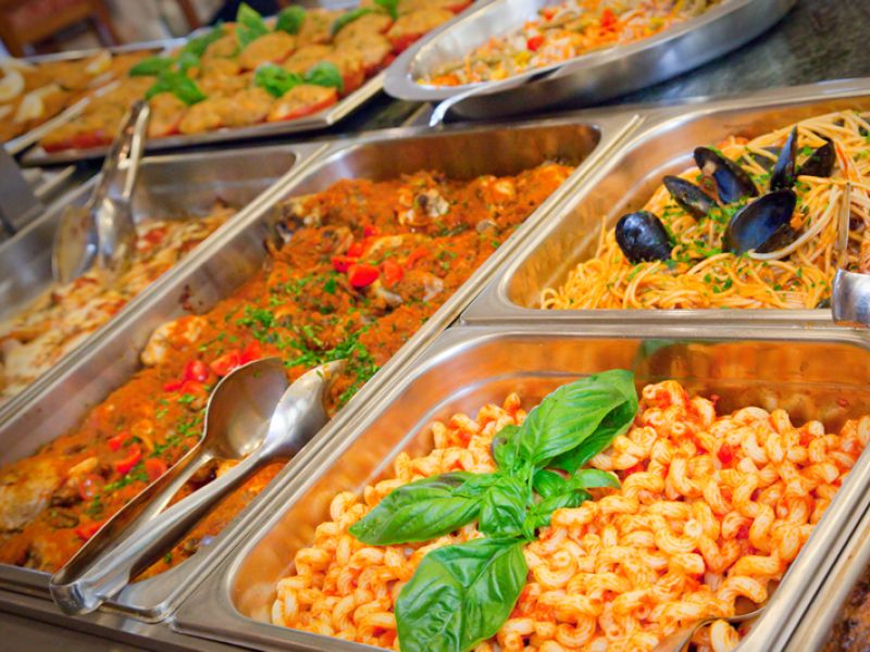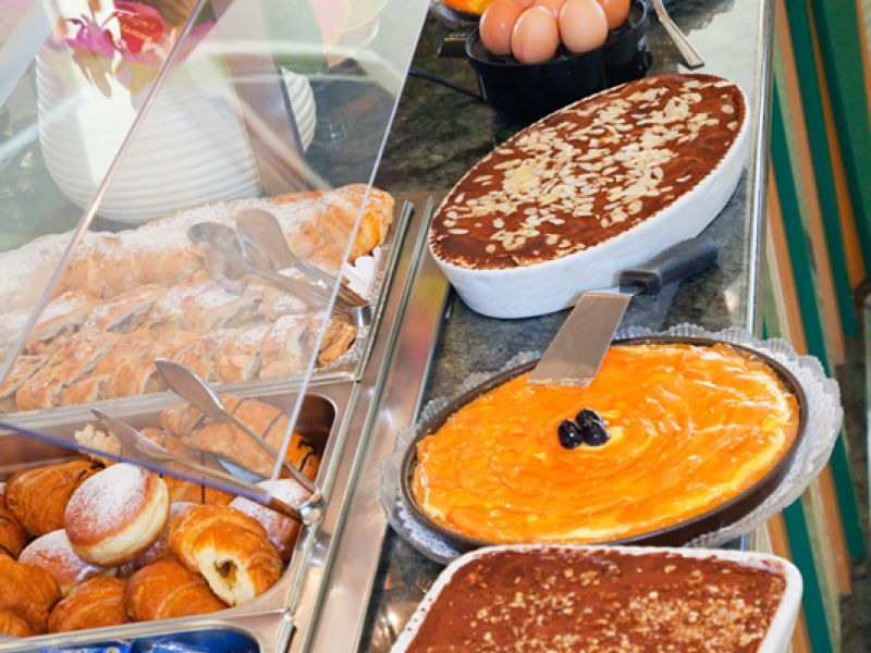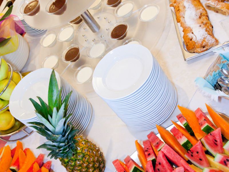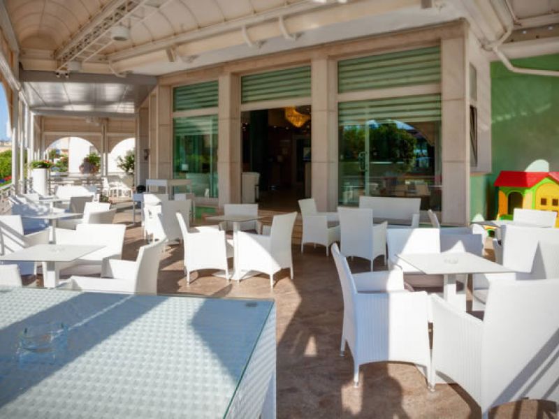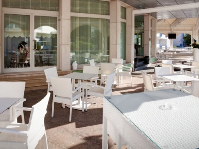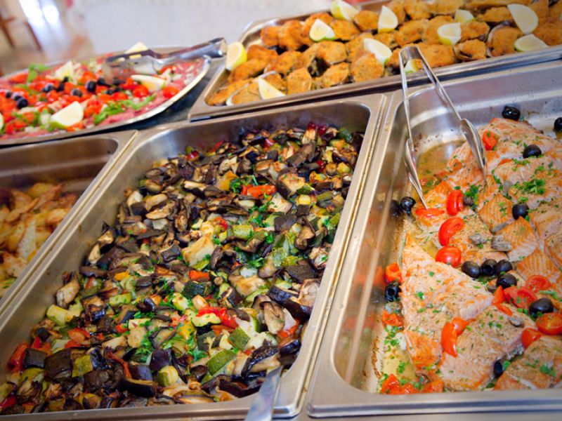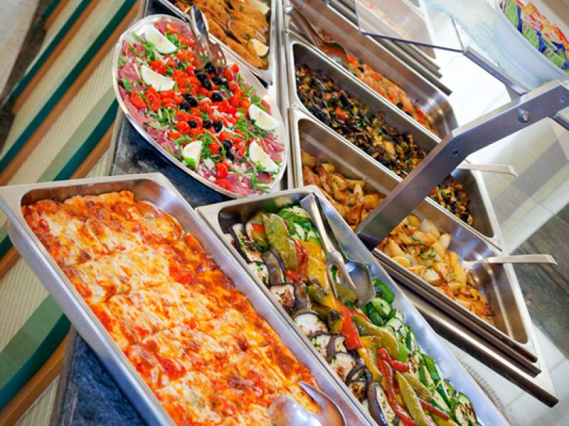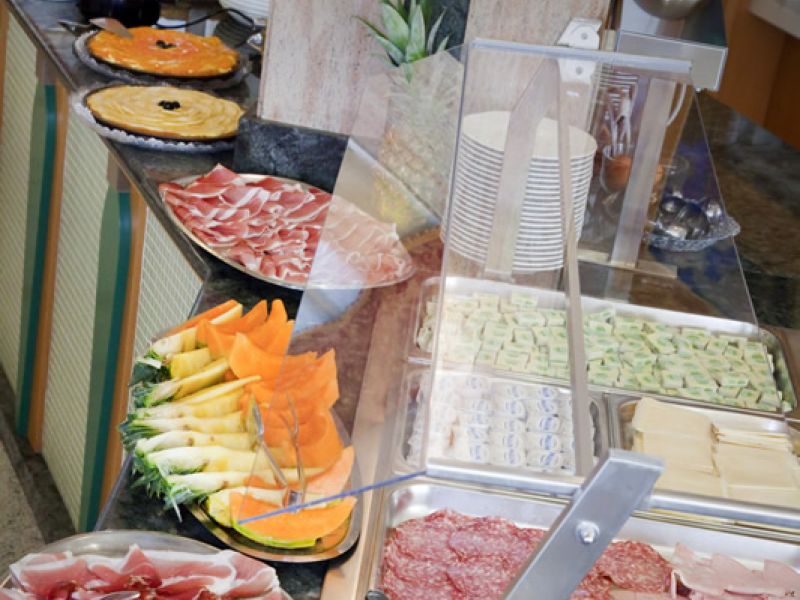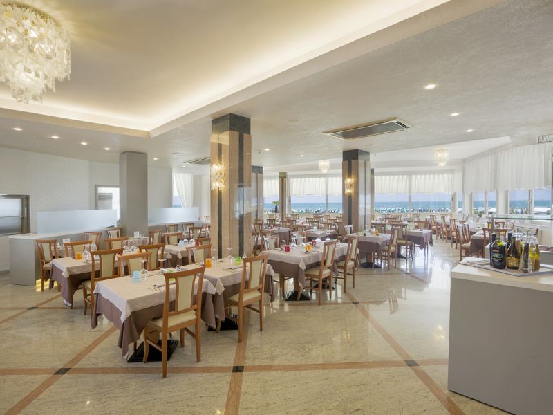 La sala da pranzo elegante e curata in ogni dettaglio, con un'ampia e luminosa vista sul mare; i pasti vengono presentati caldi e freddi a buffet free service, estremamente curati con sapori e fragranze; cucina regionale e nazionale che variano ogni giorno, in modo che il cliente possa scegliere liberamente al momento tra una vasta varietà di piatti.